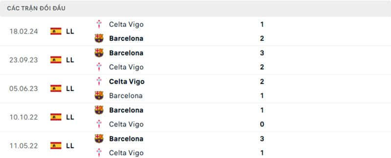 Thành tích đối đầu Celta Vigo vs Barcelona
