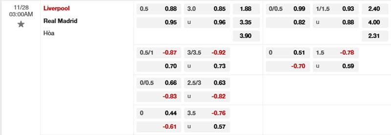 Tỷ lệ kèo Liverpool vs Real Madrid