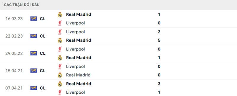 Thành tích đối đầu Liverpool vs Real Madrid