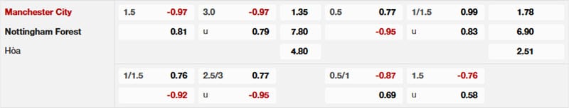Bảng tỷ lệ kèo Man City vs Nottingham