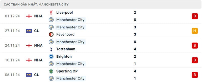 Phong độ gần đây Man City vs Nottingham