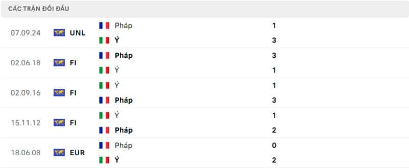Thành tích đối đầu Ý vs Pháp